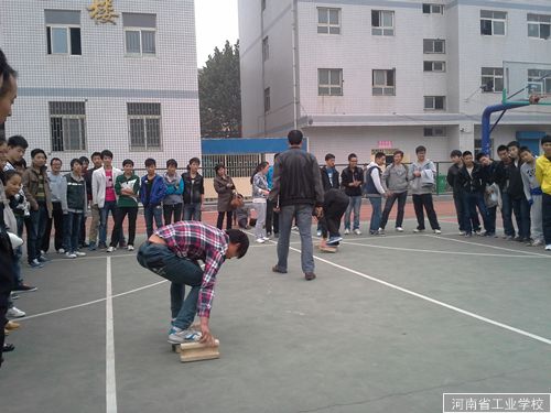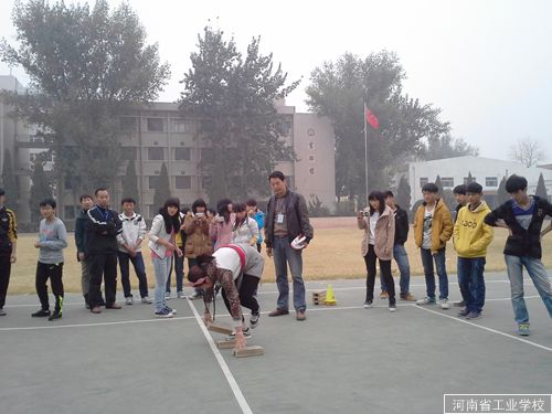接下来进行的是“摸石头过河”项目接力比赛。同样每班参赛8人分两组,10米距离迎面接力。每个队员拿3个木砖在地上,两脚分别站在2块木砖上,然后捡起第三块木砖,放在前面,用脚踩着木砖,反复交替通过木砖移动过河。最后一组队员返回起点计时停止,用时少者获胜。在裁判宣读完规则后,比赛分三组随即开始。参赛队员手脚并用,动作协调,三块木砖交替在赛道上往返,队员个个你拼我赶。场边班主任带着同学们加油呐喊。比赛在紧张、有序、欢乐的气氛中圆满结束。最终13数控、11升学分别获得冠亚军。