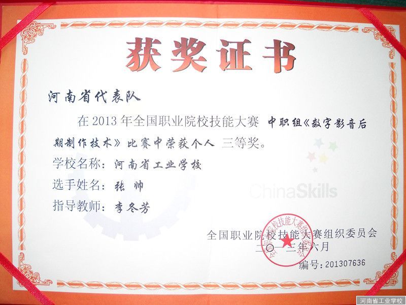 6月25-28日,在天津仪表工业学校举办的2013年全国中职院校技能大赛,共有来自全国各地的127所中等职业学校、512位选手参加了数字影视制作、工业产品设计、动画设计、企业网搭建的竞赛项目。 我校学生张帅在数字影视制作赛项中沉着应战、表现出色,最终获得三等奖好成绩。