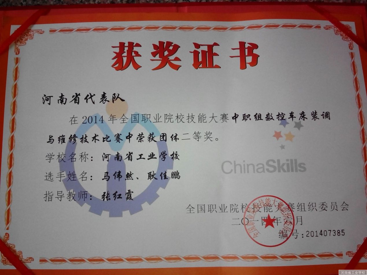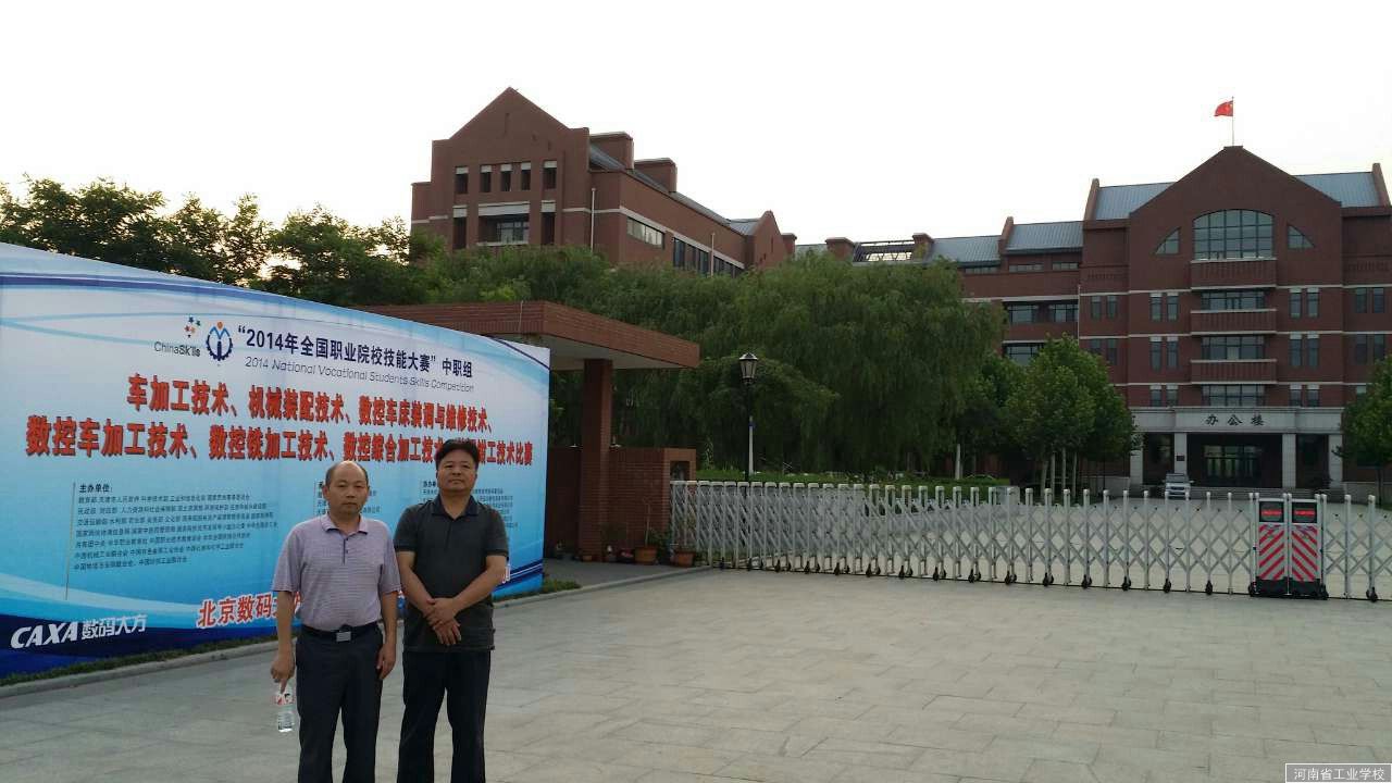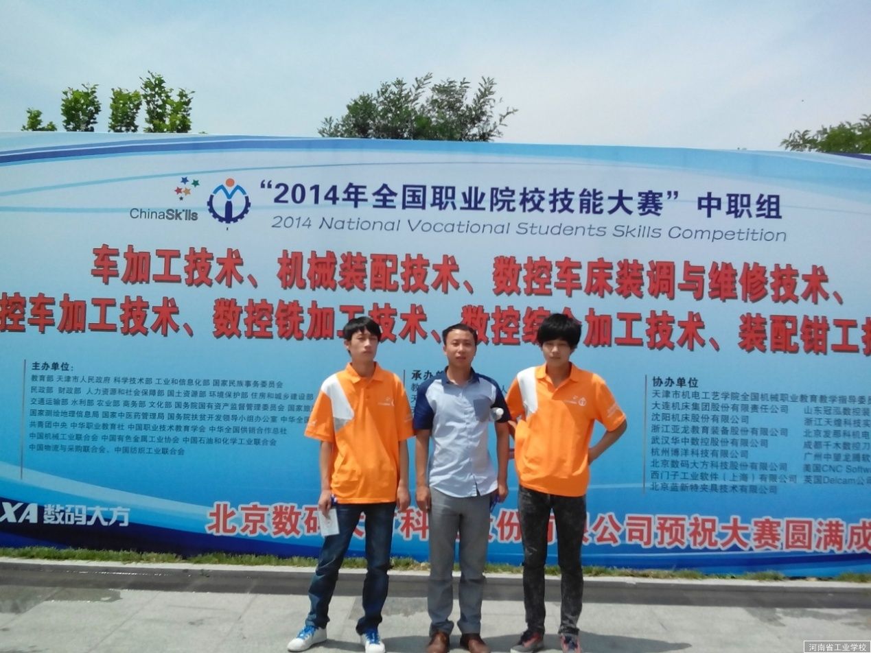 由12数控耿佳鹏、12机电马伟然两位同学组成的河南省数控车床维修团队,电气教师张红霞和数控教师张华组成了训练团队,机电系组织制定周密科学训练方案,在时间紧任务重情况下,在训练设备不完备情况下,采取送出去到中国(长葛)机床大世界实战训练,请进来邀请12年参赛选手回校现身示范训练,实训场地加班加点、不分昼夜、强化训练。6月23-26号,张校长带队,参加在天津举办的2014全国职业技能大赛数控车床维修与装调比赛,此项目既考查技术水平又考查协作能力,既有具实用性又有观赏性,经过选手奋力拼搏,获得了加工制造类项目二等奖最好成绩。同时该奖也是河南省参加加工制造类七个项目中最好成绩。