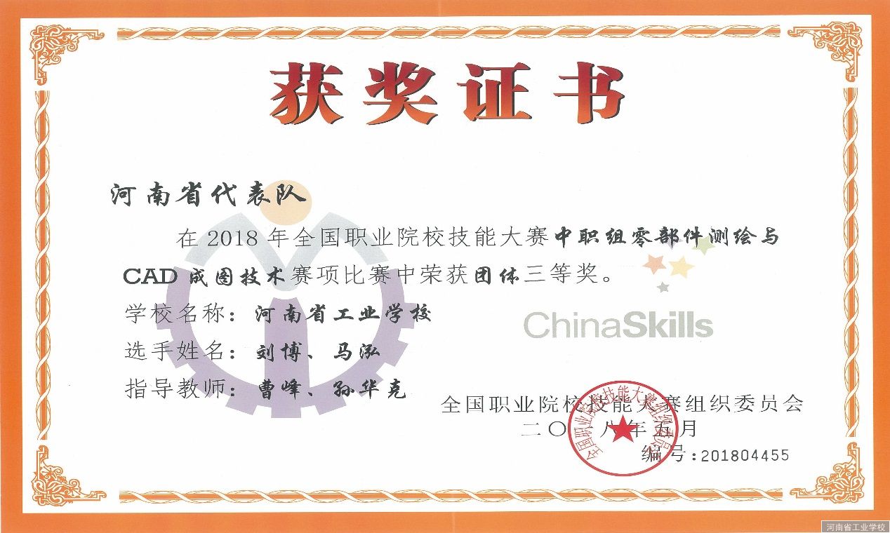 6月4日上午,从福州传来喜讯,在2018年全国职业院校技能大赛中职组“零部件测量与CAD成图技术”项目的比赛中,河南省工业学校代表河南省参赛并荣获三等奖第一名,这是我校首次参与该项目比赛并取得如此好成绩。