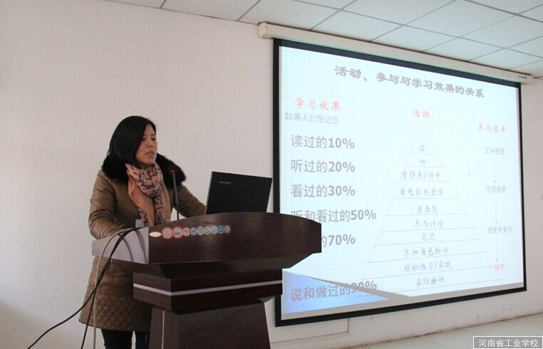 王明英老师近年来一直在研究和尝试课堂教学改革,并提出了独到的课堂教学理念——“工程教学法”,该理念已经作为2014年河南省教育厅重点项目立项。作为该项研究的主要撰稿人,王老师就“工程教学法”的定义、内容、方法向与会人员作了介绍,并和传统的教学方法——项目教学法做了对比,让大家耳目一新。最后,王明英老师就学校的教学现状,从教学方法、教学手段的方面阐述了其对教学改革的看法和建议,与所有在场的领导和老师产生了巨大的共鸣。