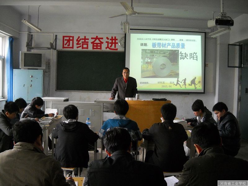 本次观摩课由张冰老师主讲,内容是铝制板带材产品质量缺陷。张冰老师由复习板带材产品缺陷分类开始,到讲授缺陷的定义、成因及防止措施。在此过程中张冰老师采用了以学生为主体的启发、提问,演示与练习相结合的教学方法,使课堂氛围充满活力和学习热情。特别是采用了工厂实物缺陷样板、图片资料-----吸引着学生的注意力,引导学生去发现问题,寻找答案,教学设计具有专业特色,起到较好的教学效果。