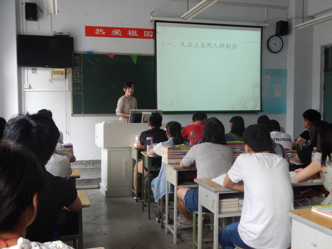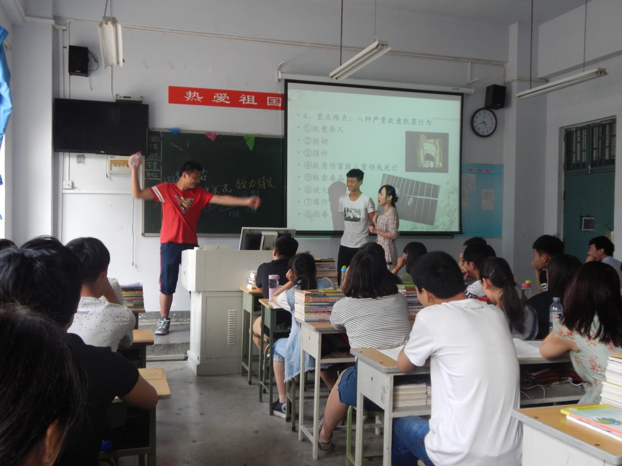 老师们观摩了刘佳凝老师的《哲学与人生》中“自然人的年龄划分”一课,深有启发,大家觉得这节课是非常成功的,通过本节课使学生了解了自然人的年龄划分的主要方法,培养学生分析问题的能力,培养学生运用所学知识分析观察身边的现象,同时了解我国现行法律的现状,并着重分析八种常见的严重违法问题。从教学目标上看,该节课教学设计符合教材和学生实际,体现了循序渐进的教学规律,如以设计问题来导入新课,从而将学习主题引入;另外又补充一些图片,激发学生学习兴趣,引导学生积极思考,落实教学的目标。从教学内容上看,重点、难点确立准确,思路清晰。从教学程序上看,过渡自然,严谨有序,层层深入,每一个环节流畅自然,专业用语严谨。从教学方法上看,主要让学生表演情景教学法。教法上学生自己进入、扮演角色,教学中的违法角色不再是在书上,而就是自己或自己班集体中的同学,这样,学生对教材中知识很自然地加深了内心体验。学法上设置适合学生参与的情景,激发学生探究问题的兴趣,培养学生的归纳、总结能力。