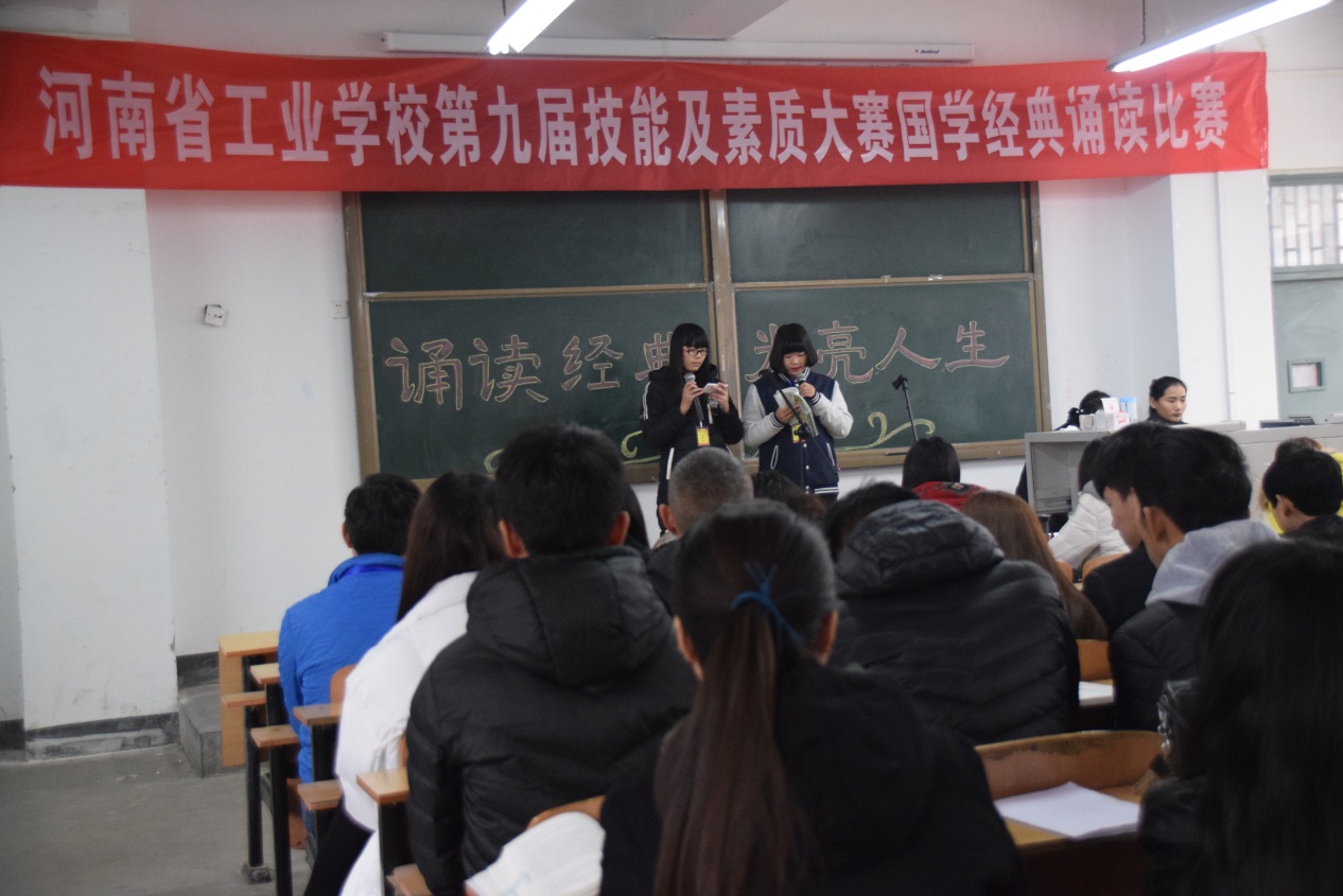 十二月八日下午两点三十分,河南省工业学校第九届技能及素质大赛《国学经典诵读》竞赛在教学楼108、208阶梯教室隆重举行。