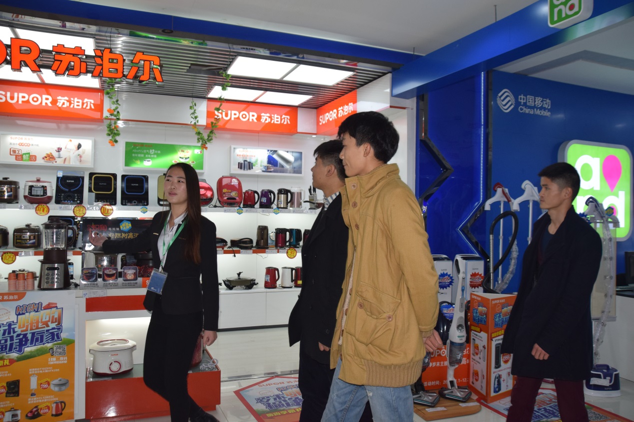 第二阶段,观摩学习。各小组在各自的柜组学习产品知识,熟悉产品价格和店庆优惠套餐,各品牌之间的差别也能略知一二,带教老师随时抽查。销售人员接待顾客时候,学生近距离观察销售人员如何接待顾客,如何洽谈,如何成交,并记录实习小结。