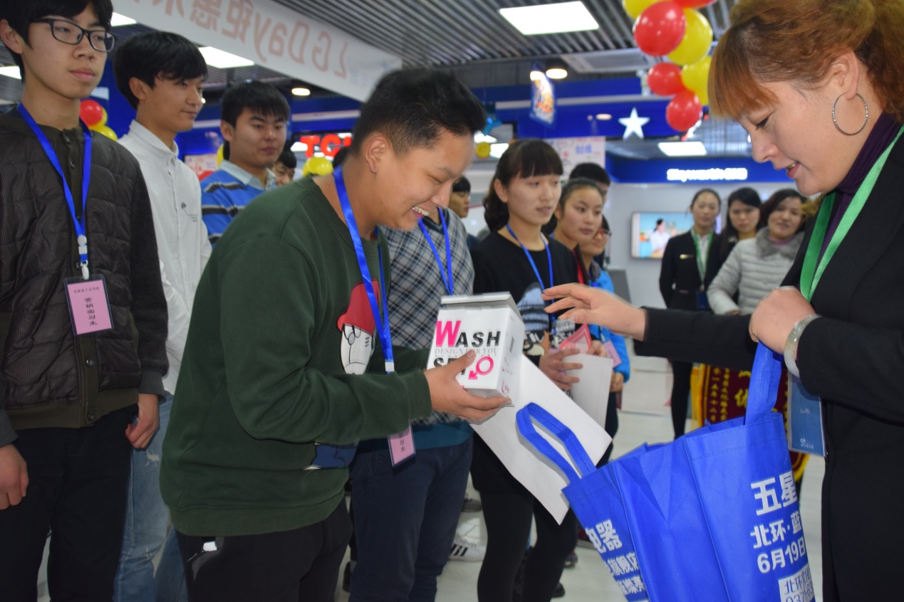 (五星电器北环文化店王店长向同学们赠送纪念品)