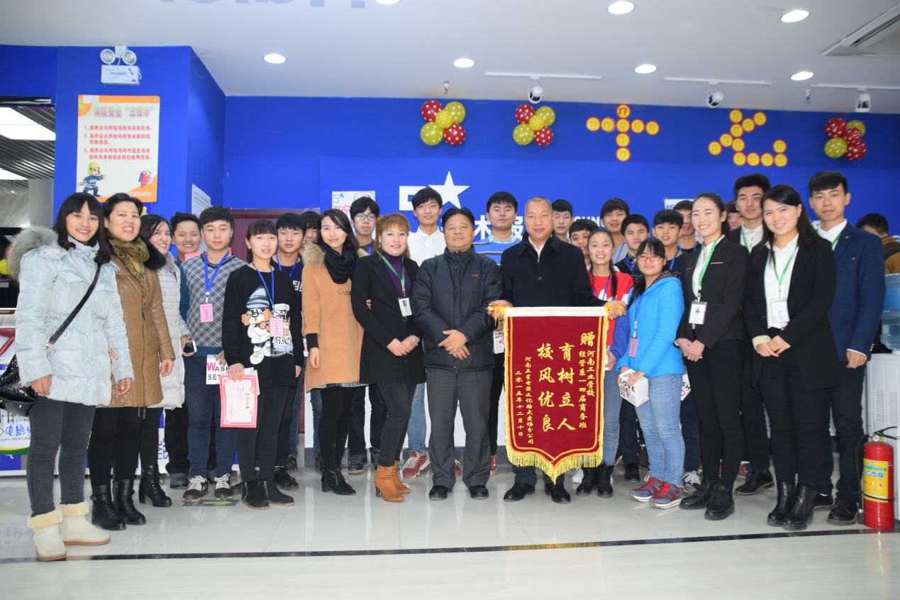 张华校长亲自到实习现场看望大家,对学生实习给予肯定并提出了学校的希望,双方达成合作,认定五星电器文化路北环店为河南省工业学校营销专业实习基地,并举行了挂牌仪式。2015年12月12日,是该专业学生校外实习的结束时间,也是让他们记忆深刻的日子。由于他们的优异表现,五星电器文化路大卖场分公司为该班级制作了“育树育人、校风优良”的锦旗,王店长表扬实习中特别突出的李澳、李明霞、张婷婷、浮晨阳、苑乾阳等5名同学并颁发奖状,最后王店长亲自送14商务班每人一份精美礼物作为纪念,同学们倍受鼓舞。