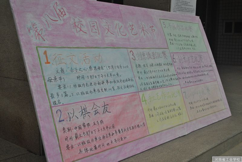 按照工作计划,我校于4月25日至5月30日举办了第八届校园文化艺术节,本届校园文化艺术节的活动原则是“人人参与,欢乐创新”,让每一位同学都能参与进来,享受艺术的熏陶,营造良好的氛围。让每位学生都能展现自身特长,挖掘自身潜力,提高艺术素养。