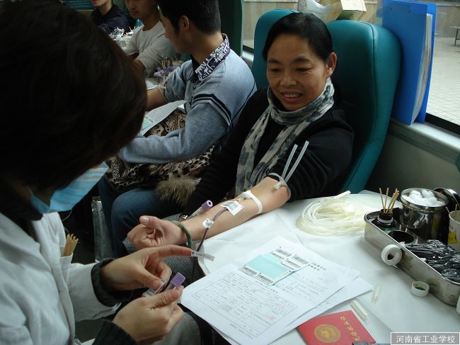 6日下午2:40,河南省血站中心的采血车开进了我校的校园,来献血的同学热情高涨,早早地排起了长长的队伍在教学楼前等候。3点钟待血站医护人员准备就绪,同学们便在他们的指导下秩序井然地填好献血表进入献血区进行登记、基本情况核实、量血压、验血等的相关准备活动。经验血合格,最后进入献血车进行献血。整个献血过程中许多同学的脸上都流露着热情的微笑,也有的刚开始略显紧张,但在医护人员的安抚与鼓励下,都渐渐放松了心情,并顺利地完成了献血。这次活动,一些学生由于某些情况不符合献血标准不能献血,都感到非常遗憾。参加献血的同学都纷纷表示,以后还会继续积极参与。据统计,我校学生本次总献血量达1万毫升。