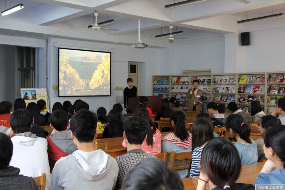 讲座开始前,我校赵新荣老师用中英文介绍本期讲座主题,对班·本杰明的到来表示欢迎,图书馆汪海平馆长做关键词翻译。讲座中,班·本杰明从地理、历史、文化、体育以及匈牙利的发明等方面给大家介绍了他的国家——匈牙利。匈牙利位于欧洲中部国家,首都布达佩斯,国内最大湖泊为巴拉顿湖,教堂遍布大街小巷,葡萄酒闻名世界。班·本杰明在他的PPT中用大量精美的图片展示了他美丽的家乡,古色古香的城堡、教堂、葡萄种植园、作为休闲场所的巴拉顿湖等。另外,在讲座中,班·本杰明多次表达了中国是个很大的国家,非常喜欢中国。充满自信又有率直性格的班·本杰明得到在场师生的一致喜爱。
